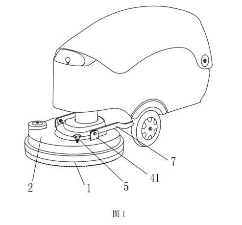 有益效果是:本實(shí)用新型在使用過(guò)程中,當(dāng)調(diào)節(jié)螺栓向下運(yùn)動(dòng)吋,電機(jī)固定板受カ繞鉸接軸轉(zhuǎn)動(dòng),產(chǎn)生偏擺,也帶動(dòng)刷盤組件向一側(cè)偏擺,從而増大了刷盤毛單側(cè)對(duì)地面的壓力,進(jìn)而在刷盤旋轉(zhuǎn)過(guò)程中形成了一定的牽引力,使刷盤轉(zhuǎn)動(dòng)更加輕松,減輕了操作者的疲勞強(qiáng)度;同時(shí),可根據(jù)地面條件的不同,對(duì)調(diào)節(jié)螺栓的旋入程度進(jìn)行調(diào)整,即調(diào)整對(duì)電機(jī)固定板的壓カ大小,從而改變刷盤毛單側(cè)對(duì)地面的壓力,以實(shí)現(xiàn)不同地面條件下?tīng)恳Υ笮〉倪m度調(diào)整。